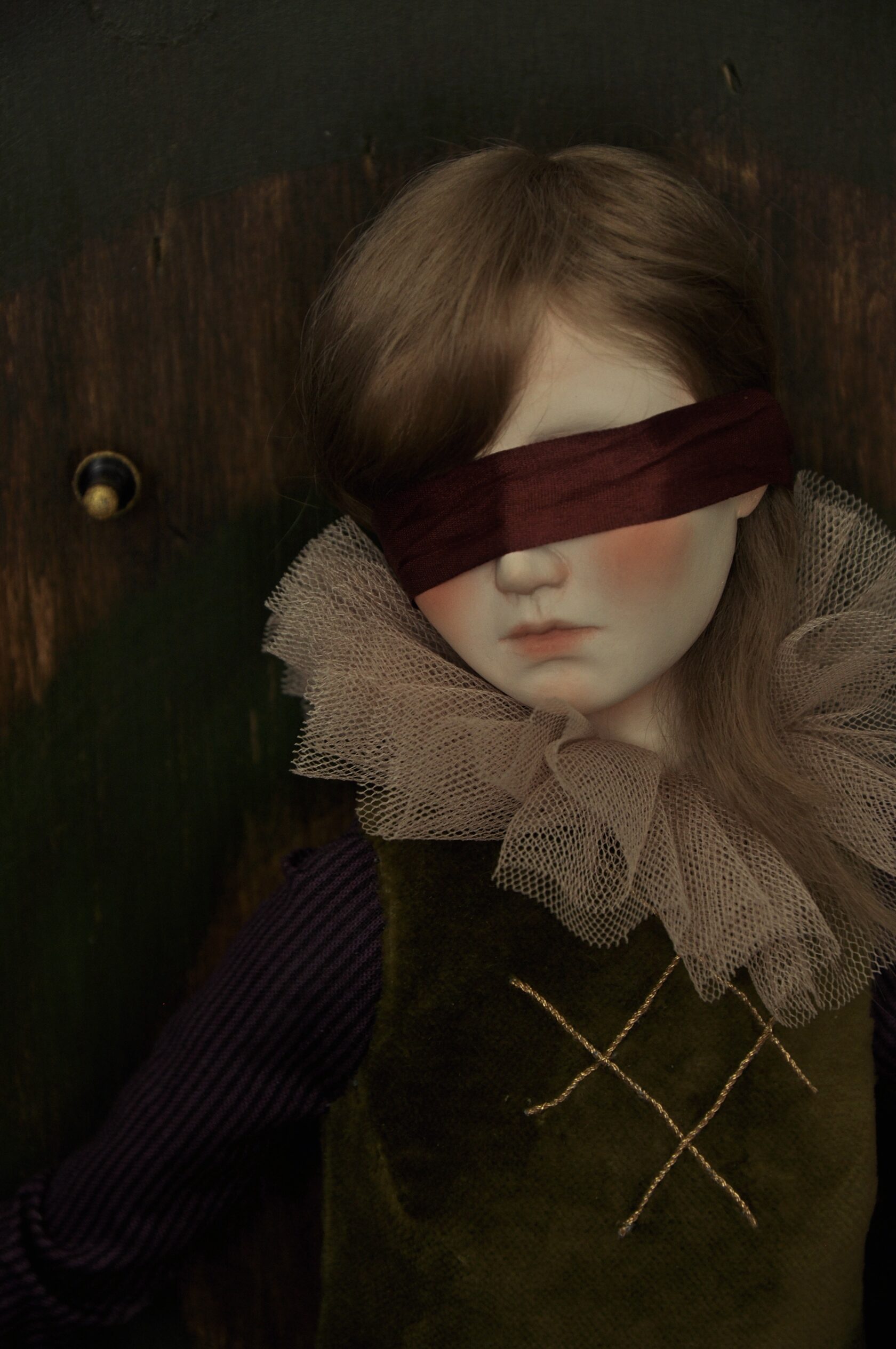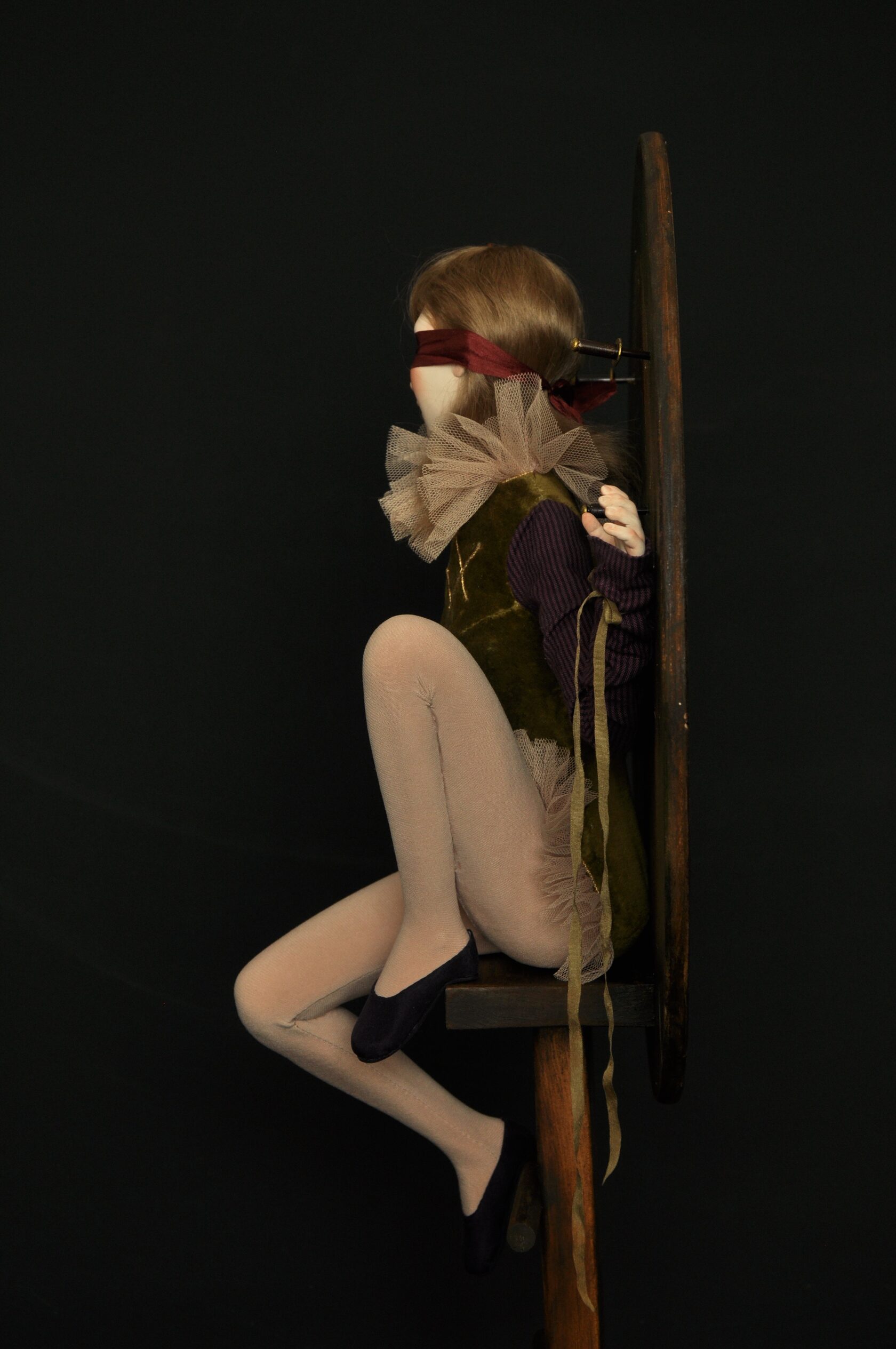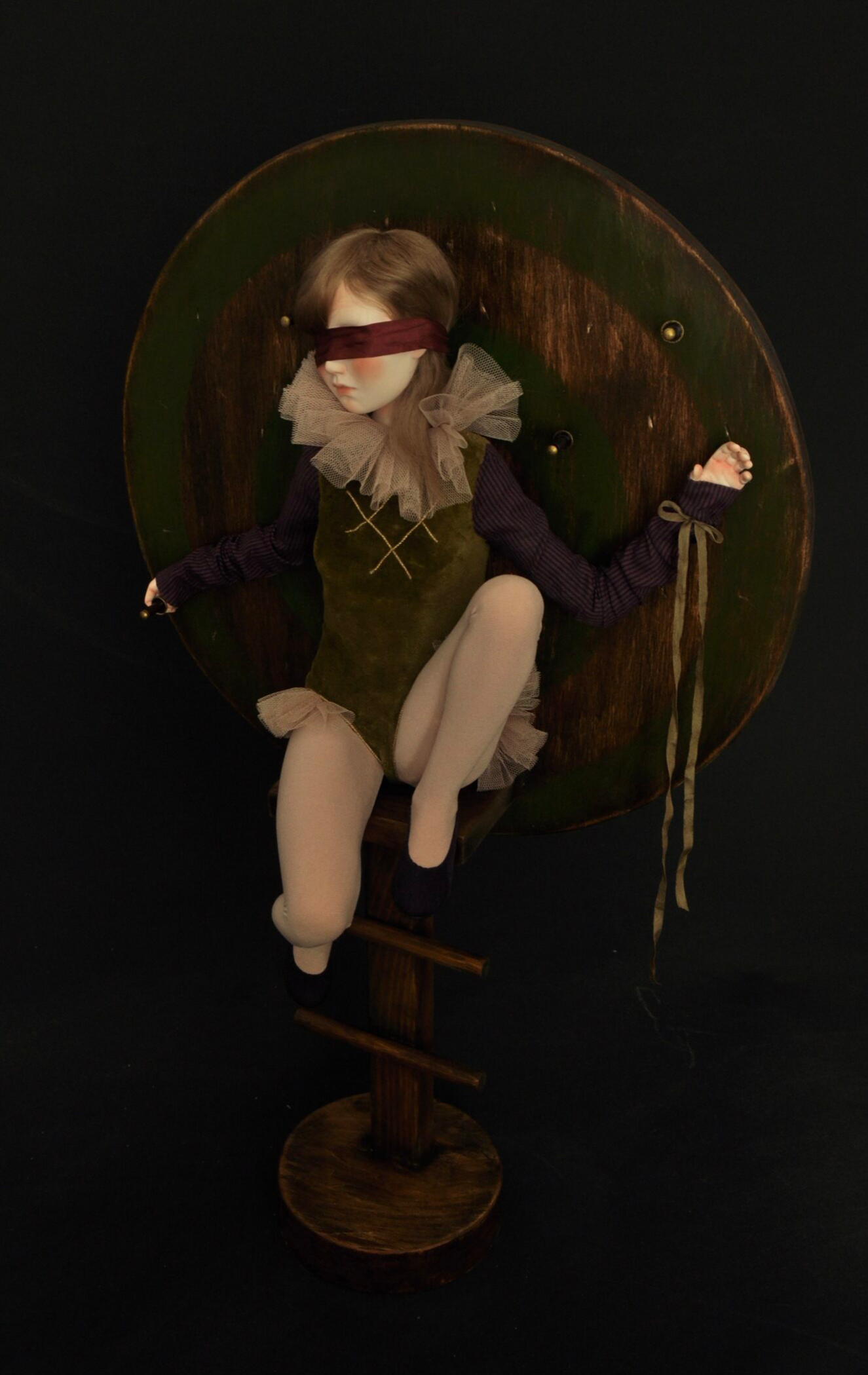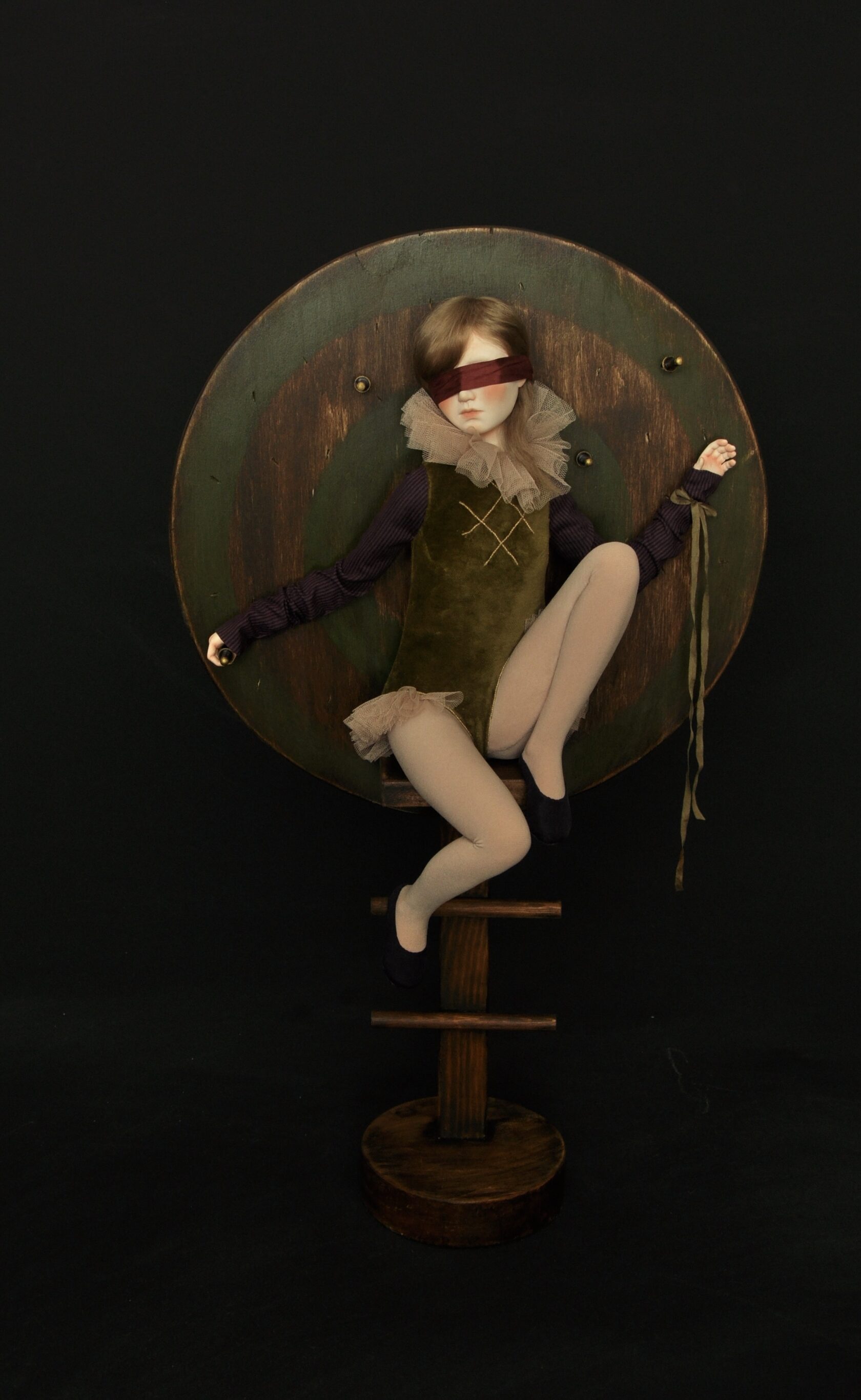 Девушка сидит на цирковой стойке, за её спиной — деревянный щит, покрытый следами ударов. На глазах — повязка: не как жест героизма, а как символ добровольной слепоты перед будущим. Одна рука привязана к щиту лентой — не верёвкой, не цепью, а чем-то хрупким, почти декоративным. Другая сжимает рукоять кинжала, воткнутого в сам щит. Здесь кинжал — не оружие нападения. Он — метафора возможности ответа, которая одновременно и угроза, и надежда. Он воткнут в щит, потому что: -Если вытащить его — можно защититься. Но глаза завязаны: ты не видишь, откуда придёт следующий удар. Куда бить? В кого? —Если оставить его, то он не ранит тебя. Но тогда ты остаёшься безоружной. — А если отдать его, ты рискуешь, что он вернётся против тебя. Так кинжал становится ловушкой двойного страха: страха действовать и страха бездействовать. Щит — её единственная защита. Но он же и тюрьма: она не может уйти, потому что привязана к нему. И не может закрыть глаза — они и так закрыты.