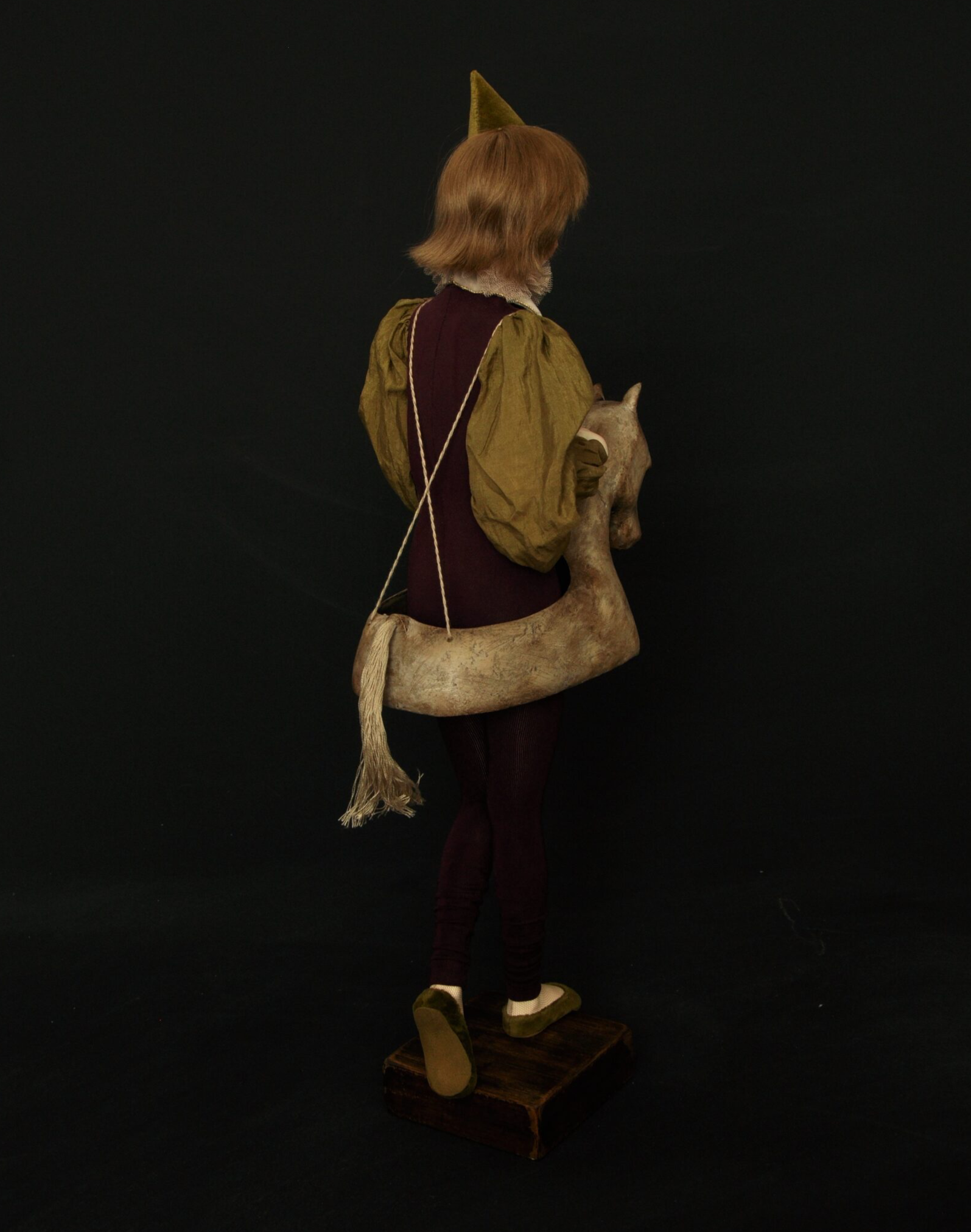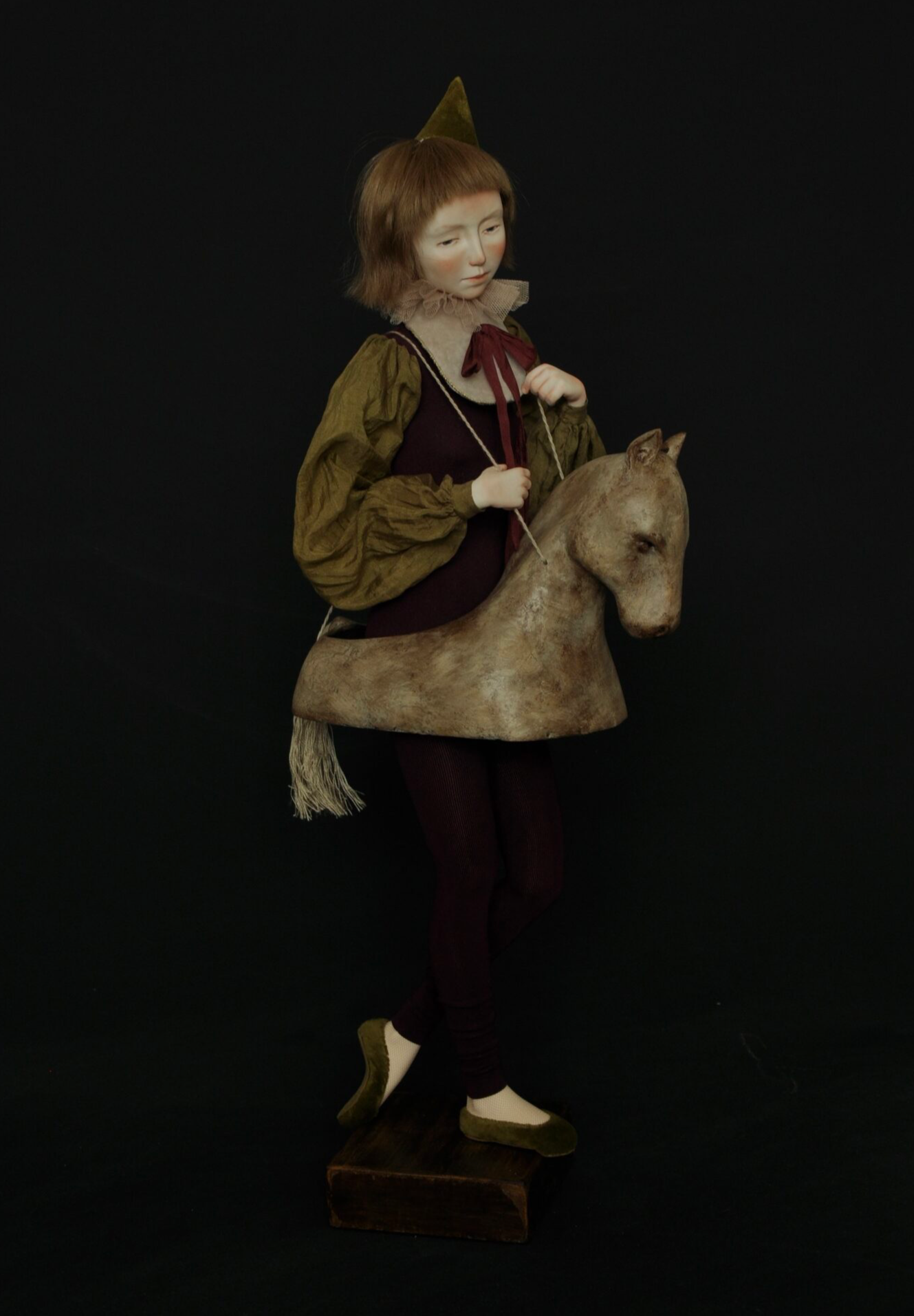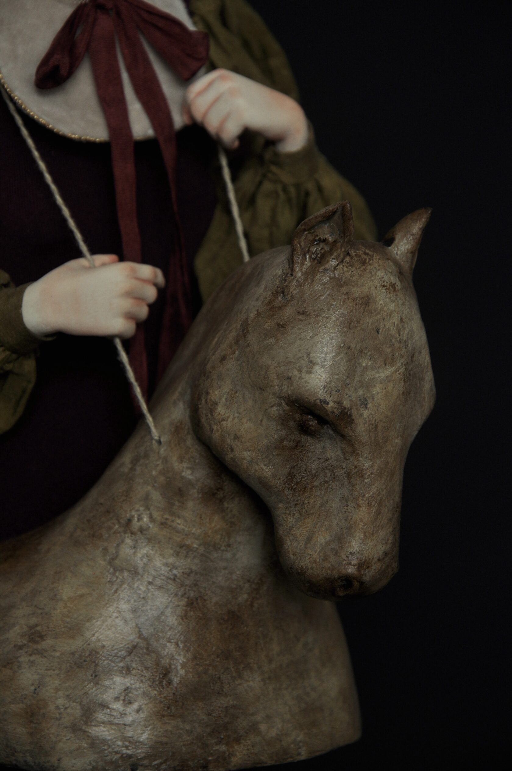 Девушка стоит прямо, спина напряжена, тело вполовину скрыто под полуфигурой лошади — не как костюмом, а как второй кожей. Чтобы конструкция не сползла и не раздавила её, она крепко держится за верёвочные лямки. Нет поводьев, нет наездника, нет цели. Есть только груз, который она сама когда-то выбрала нести — и который давно перестал быть выбором. Этот образ — не о жертвенности и не о долге. Он о привычке быть тем, кем тебя считают. О ролях, которые мы принимаем за «я»: «хорошая дочь», «надёжный сотрудник», «сильная женщина». Со временем они становятся настолько привычными, что снять их страшнее, чем нести. Мы держимся за лямки не потому, что хотим идти вперёд, а потому что боимся: без этого груза мы перестанем быть узнаваемыми — даже самим себе.