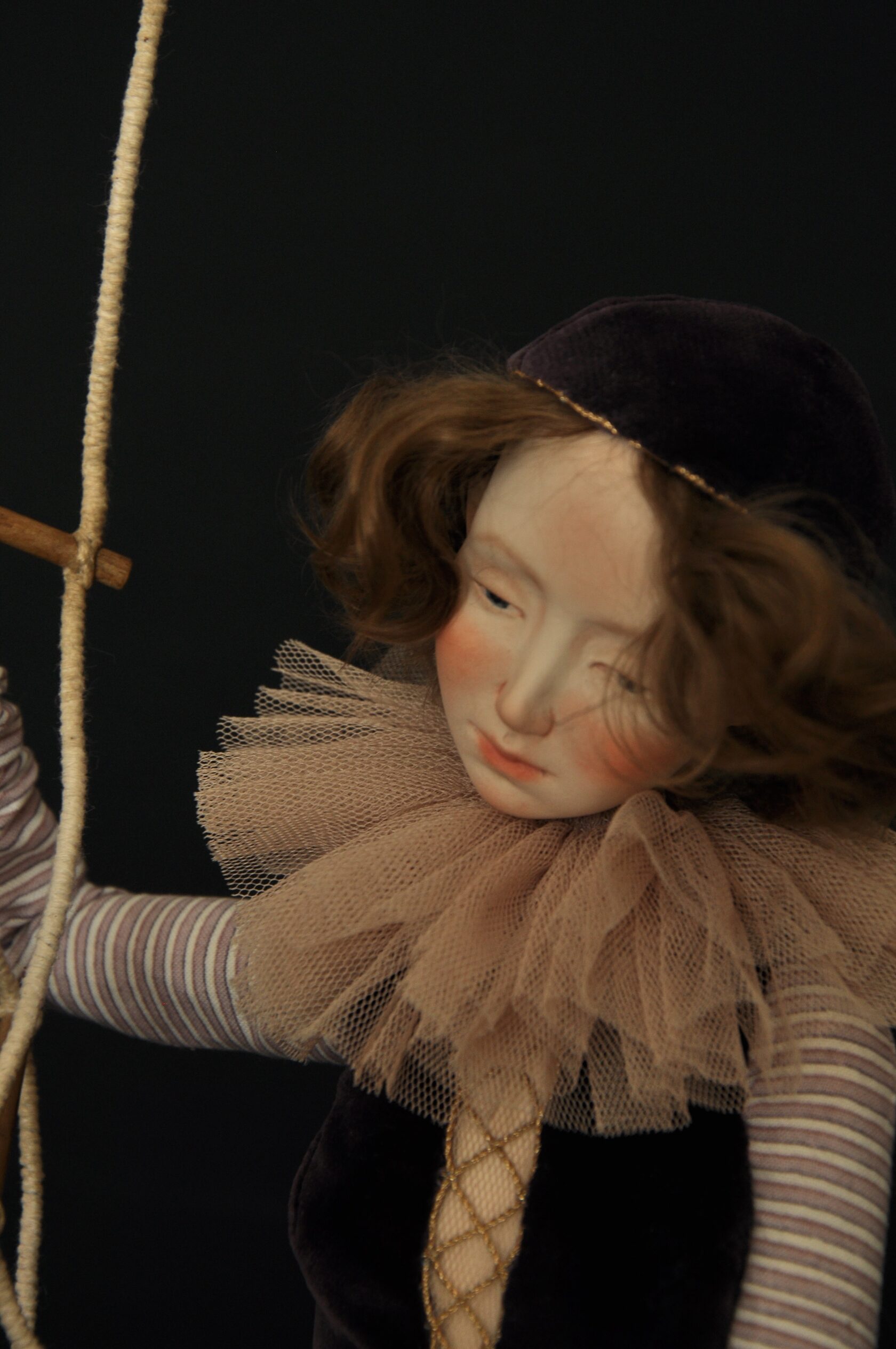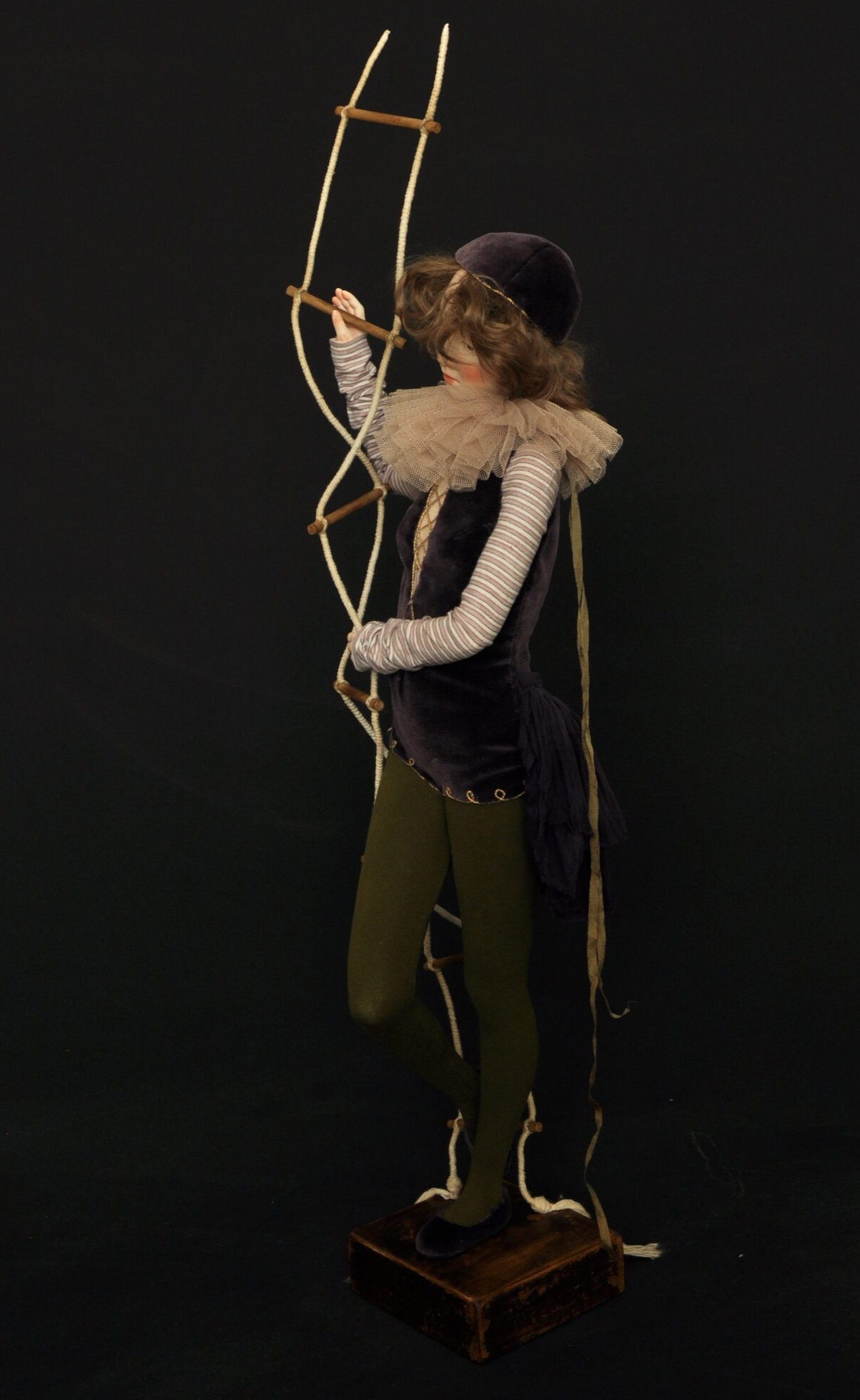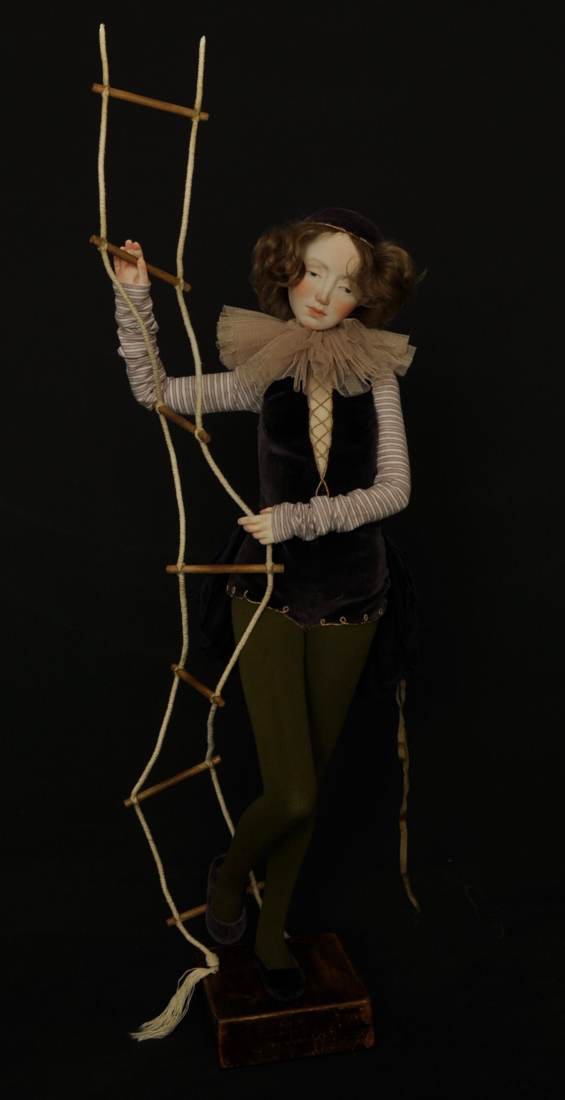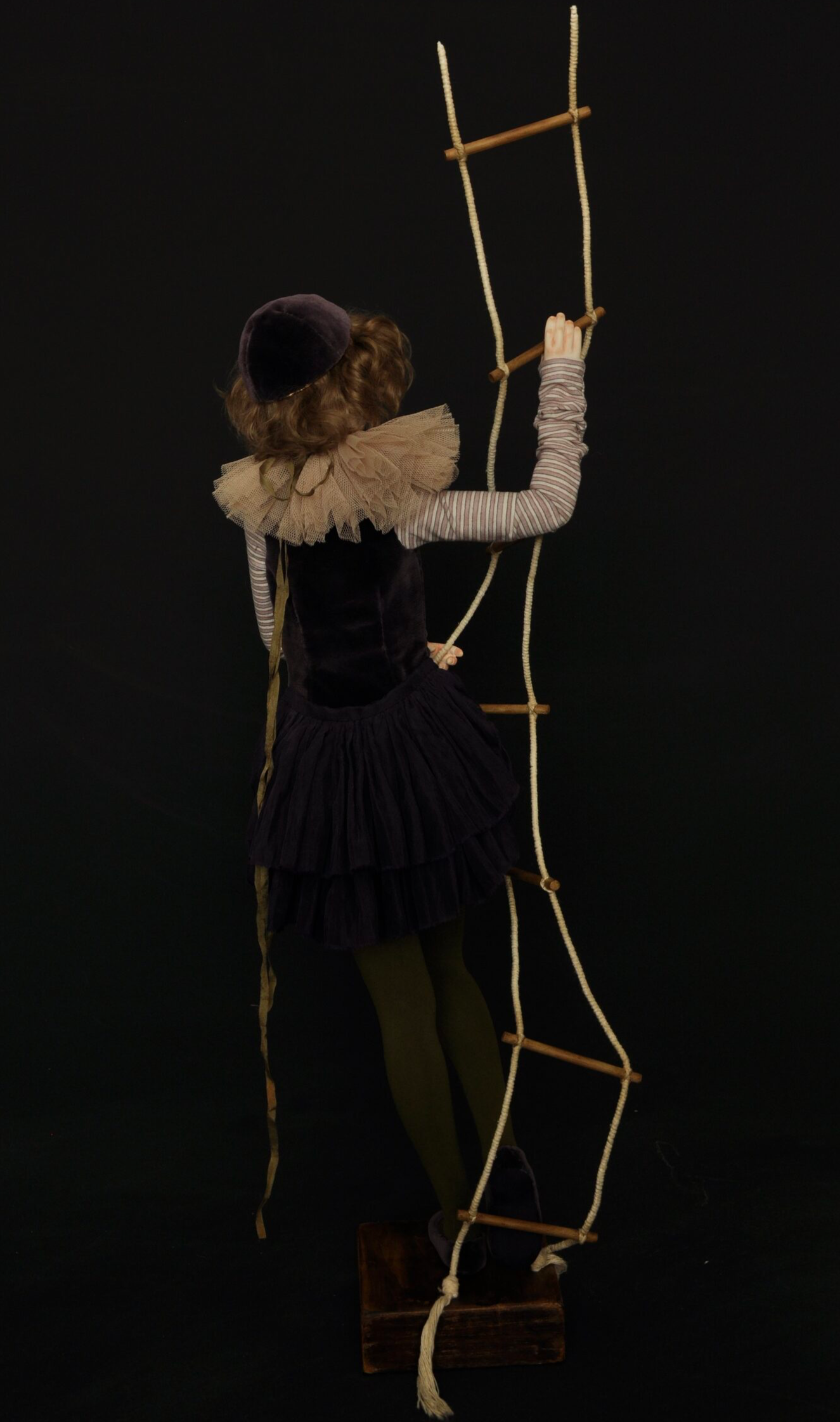 Девушка застыла в неустойчивом положении: одна нога твёрдо стоит на полу, другая — опирается на ступень верёвочной лестницы, свисающей в пустоту. Одной рукой она цепляется за верёвку, другой — держится за ступень выше. Её тело напряжено, взгляд опущен не в поиске опоры, а внутрь — в размышление: *стоит ли делать следующий шаг, если нет гарантии, что он не станет последним? Лестница не прикреплена ни к полу, ни к потолку. Она просто висит — как решение, которое ещё не принято, как обещание, в которое уже не верится, но от которого нельзя отказаться. Эта работа — не о выборе между «вверх» и «вниз». Она о состоянии, когда «сам акт выбора становится угрозой». Подъём кажется предательством прошлого, спуск — отказом от будущего. И тогда человек остаётся «между» — не в движении, а в ожидании, которое само по себе становится формой существования. Здесь нет драмы падения. Есть тишина перед решением, в которой даже дыхание кажется слишком громким — потому что каждый вдох — это ещё один момент, когда можно было бы двинуться… но не двинулся.